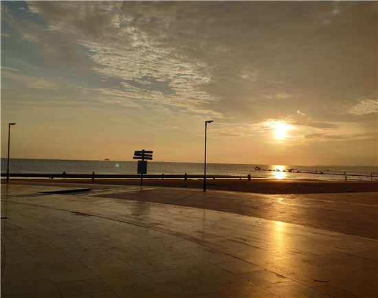 开学报道第一天,我早早地来到了烟大,看见东门海上旭日薄发,晨光刺破黑暗,一道金黄的光辉洒向大海上,初生的太阳还未彻底赶走黑暗,展现在我眼前的是光与黑暗交织的黎明,一半天明一半黑。