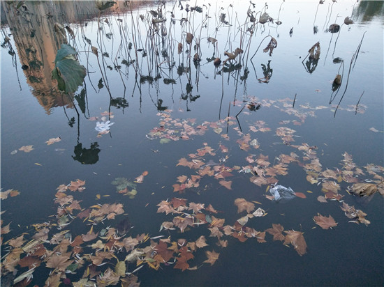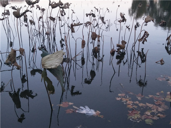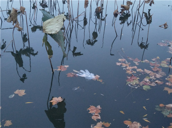 该图由手机拍摄于上周烟大的三元湖边,枯荷、落叶、静谧的湖是烟大飒飒秋意的写照,当然,被随意丢弃的白色塑料也是令人凉意阵阵!
