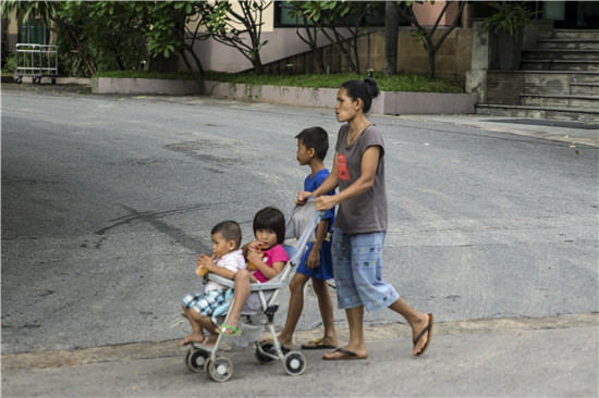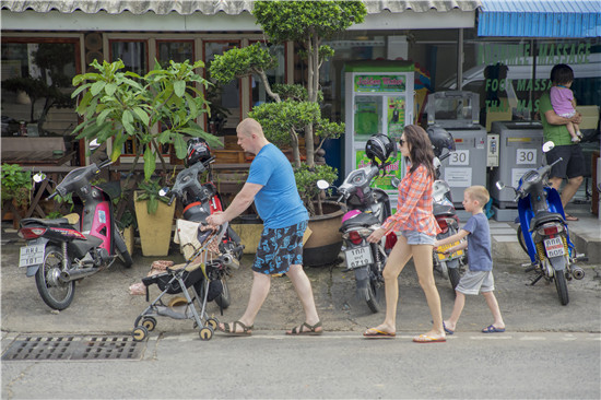 “度假”和“生活”两张拍摄于同一条街道的两边。一边是较为贫穷的泰国本土居民带着3个孩子,两个孩子济在同一辆车上。另一边一家白人游客也是一家4口路过。