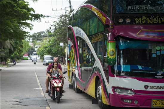 “载”一名泰国妇女骑摩托载着一名外国游客,泰国的特殊文化。