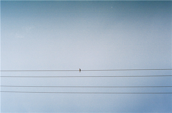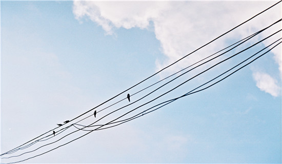 一条条电线在蓝色天空背景下谱写出了一支静谧而令人心旷神怡的《蓝色圆舞曲》,而停歇在谱线上的音符则是这些鸟儿。