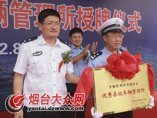 大众网烟台8月8日讯 (通讯员 于绪伟 李宇航 记者 王瑜) 8月7日上午,福山区隆重举行仪式,为“全国优秀县级车辆管理所”授牌。烟台市公安局交警支队车驾管负责人、福山公安分局在家党委成员、各警种主要负责人,公安民警及社会各界群众代表近200人参加了授牌仪式。