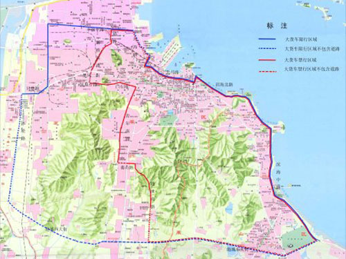 低速载货汽车(原四轮农用车)、三轮汽车(原三轮农用车)、拖拉机:全天禁止在海岸路—滨海北路—迎宾路—观海路—红旗东路—红旗中路—通世路—蓁山路—青年南路—红旗西路—化工路—幸福中路—环海路—北马路—大马路区域内的道路(不含蓁山路、化工路、环海路)通行。