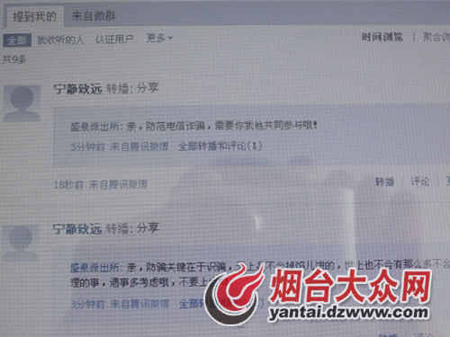 大众网烟台6月6日讯 (通讯员 孙婷婷 记者 王瑜) 为有效遏制利用互联网和电信渠道实施诈骗犯罪活动的上升势头,提高广大人民群众的防骗意识,提升社会各界广泛参与的积极性,最大限度压缩犯罪空间,烟台莱山盛泉警方从事关群众安全感的角度出发,按照省厅、市局、分局的有关要求,从我做起,在辖区范围内开展了打击、防范电信诈骗宣传活动,营造强大的舆论声势,使广大群众了解电信诈骗犯罪的主要手段和方式,避免上当受骗。