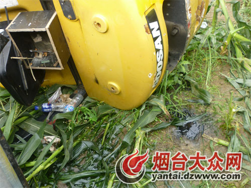 事故路段是位于大庄的一条东西方向的土路,约有三米宽,路的南侧是大片的玉米地。记者赶到事故现场时救护车已离开,只有侧翻的叉车躺在玉米地里,将玉米压倒了一片。记者看到,驾驶室严重变形,玻璃破碎,一扇窗户被摘了下来,倚在旁边的玉米秆上。泄漏的叉车机油把一块玉米地染成了黑色。