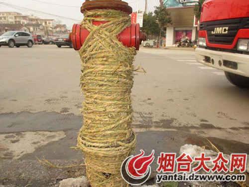 大众网烟台2月5日讯 (通讯员 邹方蕾 记者 朱军) 2月5日上午,烟台莱山消防大队消防官兵对辖区内消火栓进行维护保养后,用特制的草绳为消火栓逐一穿上“冬衣”,过新年。