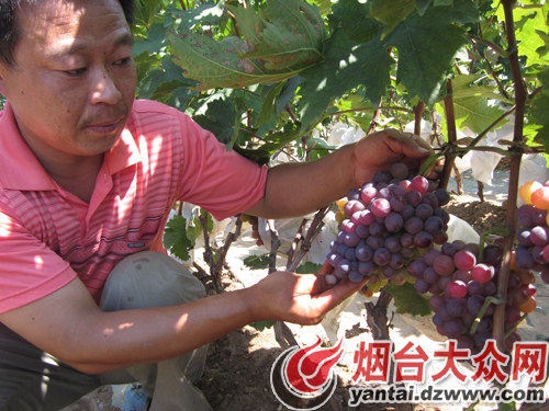 9月7日上午,李玉海一家正在葡萄地里摘葡萄。一串串刚刚摘下套袋的紫红色“大粒玫瑰香”晶莹、剔透、饱满,散发着诱人的香味。“前天一下来就卖到5块钱一斤,比平度来的玫瑰香葡萄每斤还贵2块,在咱莱州市集是卖得价格最好的,很抢手。”68岁的李玉海热情地向记者介绍道:“城里的葡萄贩子每天都早早地过来收,用不着俺到市集上去卖。”“这是什么品种?”记者问。“这叫‘大粒玫瑰香’,一个新品种,粒实大,糖度高、口感甘甜且香味十足。”李玉海介绍,他种植的这个“大粒玫瑰香”今年已到了第四个年头,“今年是一个丰收年,一亩地产4000多斤,去掉各种费用,每亩地能净赚17000多元。”据李玉海讲述,2009年,在当地街道农业技术人员的引导下,通过莱州市农艺师吕华福的引进,李玉海购进了这个被称为“大粒玫瑰香”的浙江玫瑰香葡萄新品种,并摸索出了一套适合本地的葡萄种植技术和无公害栽培技术。“我追肥是羊粪与有机肥和无机肥配比追施,羊粪不但能能疏松土壤,而且还避免了使用鸡粪和猪粪带来的一些药物残留。”“明年将进入丰产期,若明年还是今年这个价格的话,亩收入能达到三万来块钱。”老李对未来充满了期待。