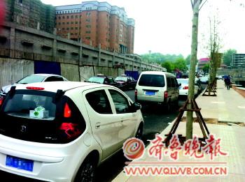 记者看到,由于毓璜顶医院新大楼的施工,毓东路上竖起一排围挡,这让原本只有10米宽的毓东路缩水了近1/3。而就在路北侧,停放的私家车从西南河路断断续续延伸到四德街,每当有迎面开来的车流交会时,行进就变得特别缓慢。