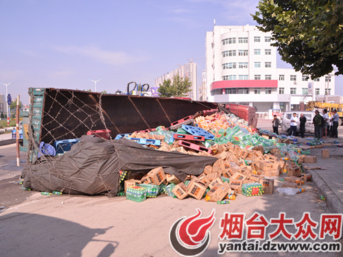 大众网烟台9月13日讯 (通讯员 王海艇 于国浩 孙菁 见习记者 林有权) 9月10日上午,一辆悬挂黑龙江牌照由青岛前往龙口的大货车,在招远市大秦家转盘处因躲避两辆横穿马路的摩托车失控翻车。虽然满满一车“雪碧”等饮料撒了一地,但周边的群众没有出现哄抢现象,现场也没有人员伤亡。