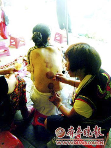 之后,将药酒倒在塑料袋里,托在手上敷向女子的背部,边敷边说“有没有感觉到发热发粘?这就是见效果了”。而市民好像真的感觉到了效果,连连点头。之后,女子又点燃一个红色的小布包,用类似艾灸的方法在市民背部操作起来。女子表示,这布包里装的全是中药,对身体有益。一套治疗做完似乎真的有效,被治疗的市民掏出300块钱给了该女子。