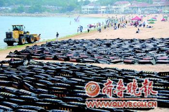 17日,青岛第三海水浴场摆放着许多正准备铺设的围油栏。本报记者 张晓鹏 摄