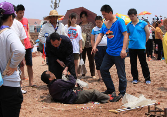 有媒体报道称6月17日在山东青岛栈桥风景区,一名残疾人在海边叫卖海螺等小饰品,在城管来检查时来不及“逃跑”,被“城管便衣”逮住后长时间殴打,被打残疾人被120医护人员送医院救治。(图片来源于网络)