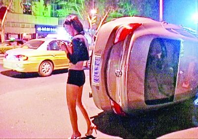 昨天凌晨,南京新街口中山东路与洪武路路口西北角,一辆北京牌照轿车撞到绿化带后侧翻在慢车道上。一名穿着时髦的年轻女子从侧翻的轿车天窗里爬出。