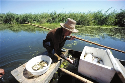 8月22日上午,记者从大河南村乘船,一路向西探访白洋淀上游。行船4公里左右,到达有着4000户村民的端村镇关城村。这个淀边的大村,多数村民已外出打工、做生意,只剩一些留守在家的中老年人偶尔划船下水,捕捞野生鱼虾换些零花钱。据村民反映,死鱼事件发生后,白洋淀中的野生鱼虾骤减,收获越来越少。以前一天能捕捞百十斤野生鱼虾,现在一天只能抓到十几条小鱼。