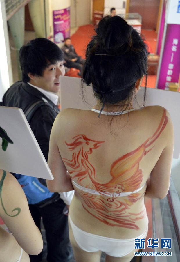 10月25日,人体彩绘模特在2012杭州国际顶级名品珠宝首饰展览会现场走秀,吸引旁人关注。 当日,为期4天的“2012杭州国际顶级名品珠宝首饰展览会”在位于杭州的浙江世贸国际展览中心开幕,来自国内外200多家参展商参加此次展会。 新华社发(施健学 摄)