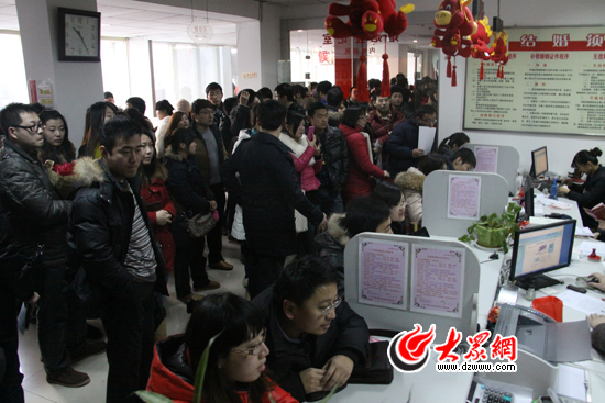 今天上午,大众网记者在济南市市中区婚姻登记处看到,刚到上午8点,前来办理结婚登记的情侣早已经排起了长队,原本早上8点半才开始办理业务的婚姻登记处不得不提前40分钟开门,为新人们办理复印、照相等业务。