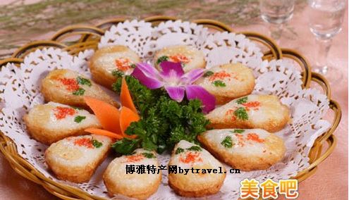 芙蓉干贝,以干贝为主料,加葱姜、清汤上屉蒸熟,再将蛋清上屉蒸熟呈芙蓉状,把蒸好的干贝撒在上面,引入高汤,淋上香油即成。蒸制成的芙蓉干贝,蛋清如同芙蓉出水,干贝恰似石榴莲子出壳,食之鲜嫩可口,回味久长。