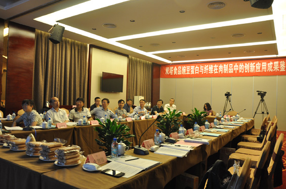 6月27日,烟台双塔食品股份有限公司召开“豌豆蛋白与纤维营养价值及其在肉制品加工中的创新应用研究成果”鉴定会,来自农业部、科研院所、肉食品知名企业组成的专家评审组,对项目进行考评。图为考评现场。 记者 张雪松 招远摄影报道