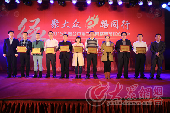 烟台市网络文化办公室副主任宫志刚、大众网烟台站站长吴磊为获奖银行代表颁发奖牌