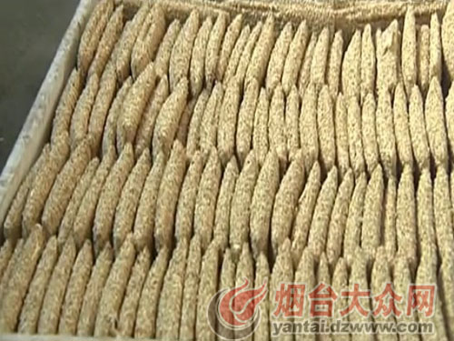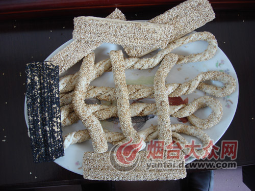 这里说的糖,就是著名的胶东大糖。在当地,人们习惯亲切地称它为“水盘芝麻糖”。