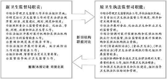 经中央机构编制委员会办公室、人事部批准,卫生部对四个机构进行了调整。将原先的卫生执法监督司更名为卫生监督局(主要职能见下表);成立直属事业单位———卫生部卫生监督中心,负责承办法定范围内的行政许可和资质认定,承担制订卫生监督执法检验技术规范;开展卫生法律、法规、标准宣传教育;协助开展卫生监督检查,配合查处大案要案。