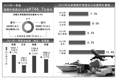 今年一季度,我国外贸进出口总值9746.7亿美元,扣除汇率因素同比增长13.4%