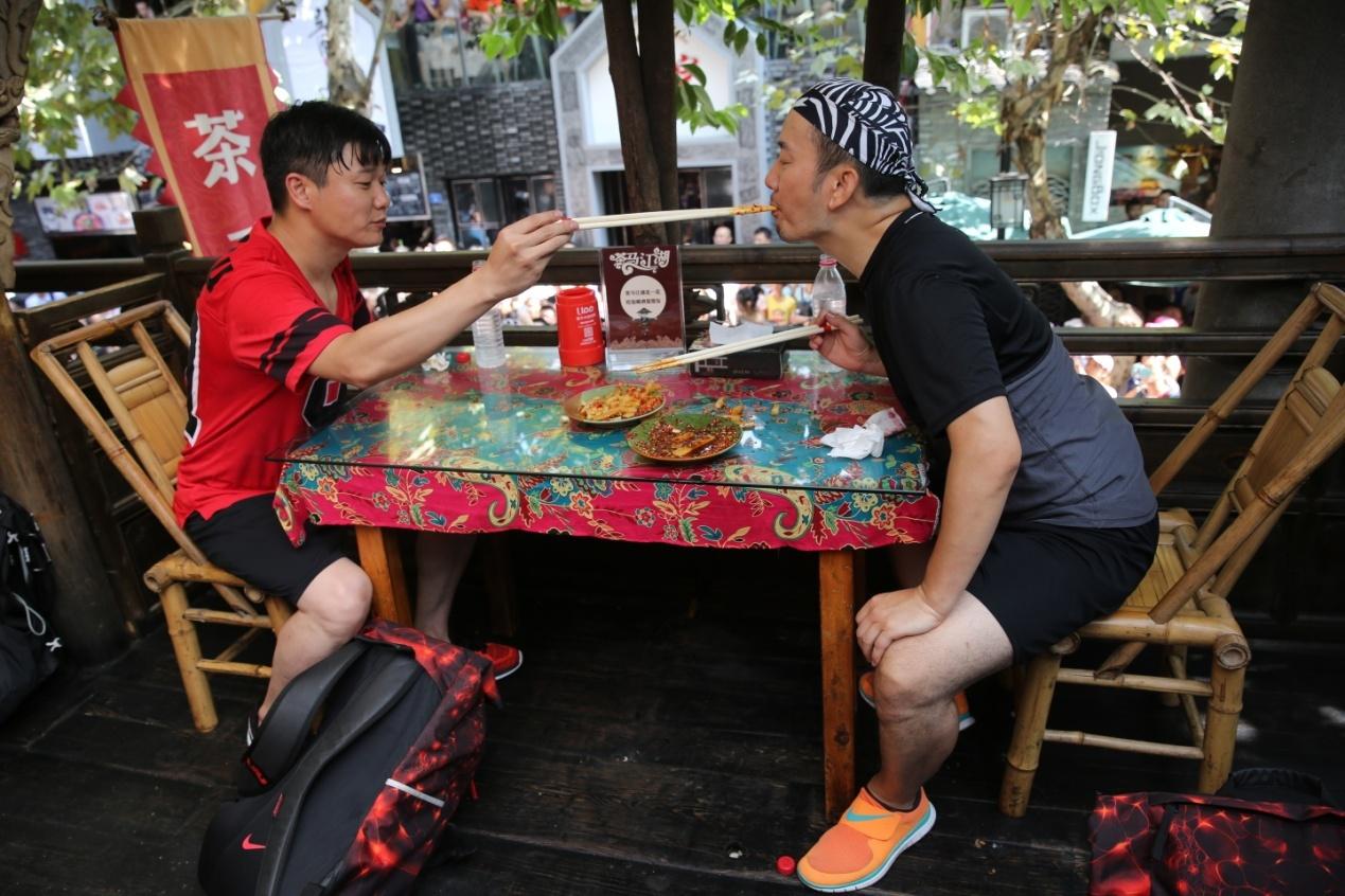 在热情的成都群众围观下,筷子兄弟坐到桌子前开始挑战,可惜出师不利,“筷子功”不够深厚的他们被凉粉屡次打败,他们辛辛苦苦吃到半碗左右时却被无情的裁判判罚重新开始,让王太利急得开始埋怨肖央“我可从来没掉过(凉粉)”!