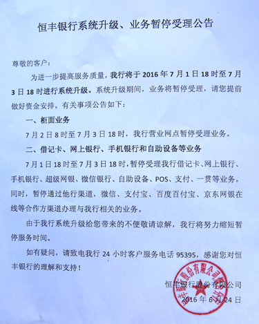 如有疑问,请致电我行24小时客户服务电话95395,感谢您对恒丰银行的理解和支持!