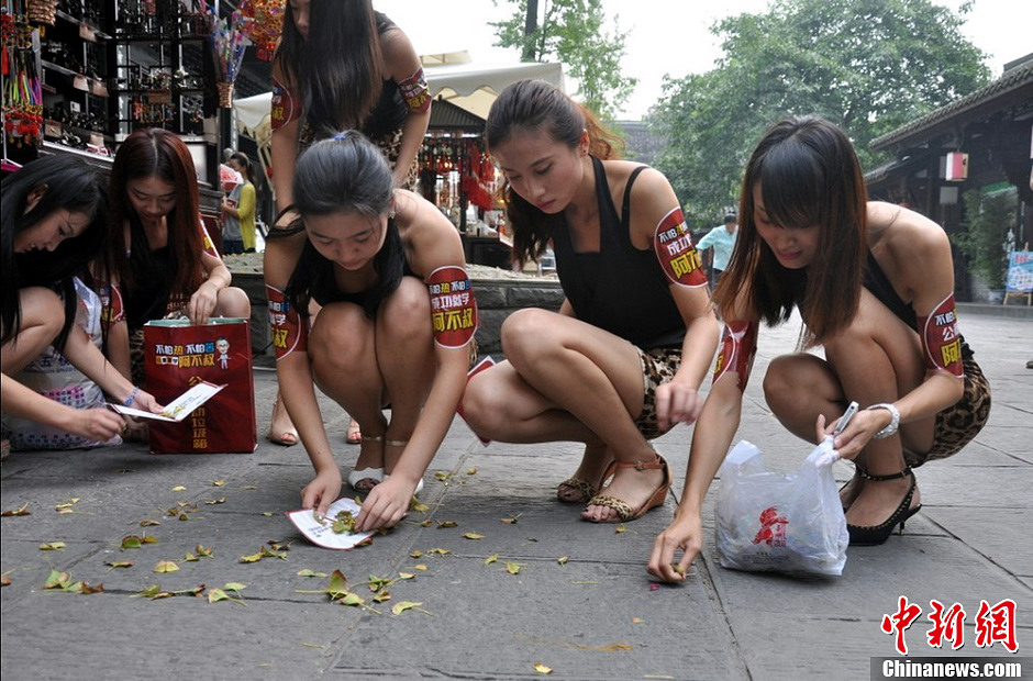 8月28日,“豹女郎”们在锦里古街捡垃圾。当天,40名身着豹纹露背短裙装的性感“豹女郎”提着公德移动垃圾桶亮相成都锦里,在锦里古街进行了“不怕热,不怕苦,公德就学阿不叔”公德接力活动。中新社发 林峰 摄