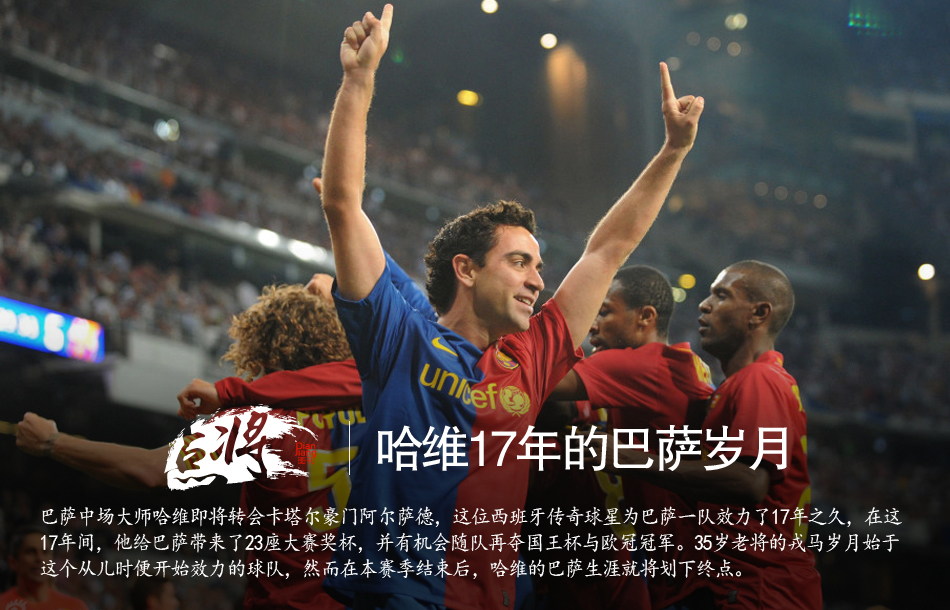 巴萨中场大师哈维即将转会卡塔尔豪门阿尔萨德,这位西班牙传奇球星为巴萨一队效力了17年之久,在这17年间,他给巴萨带来了23座大赛奖杯,并有机会随队再夺国王杯与欧冠冠军。35岁老将的戎马岁月始于这个从儿时便开始效力的球队,然而在本赛季结束后,哈维的巴萨生涯就将划下终点。