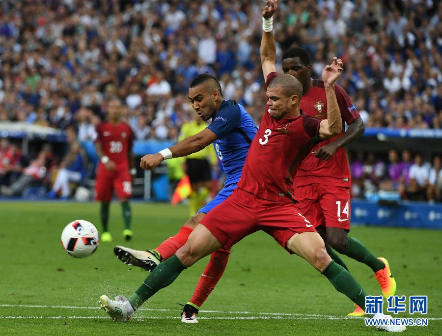 7月10日,法国队球员帕耶(左)在葡萄牙队球员佩佩的防守下射门。当日,在法国巴黎进行的2016年欧洲足球锦标赛决赛中,法国队对阵葡萄牙队。 新华社记者郭勇摄