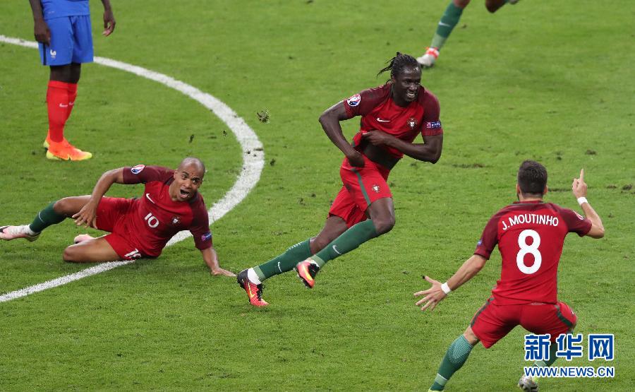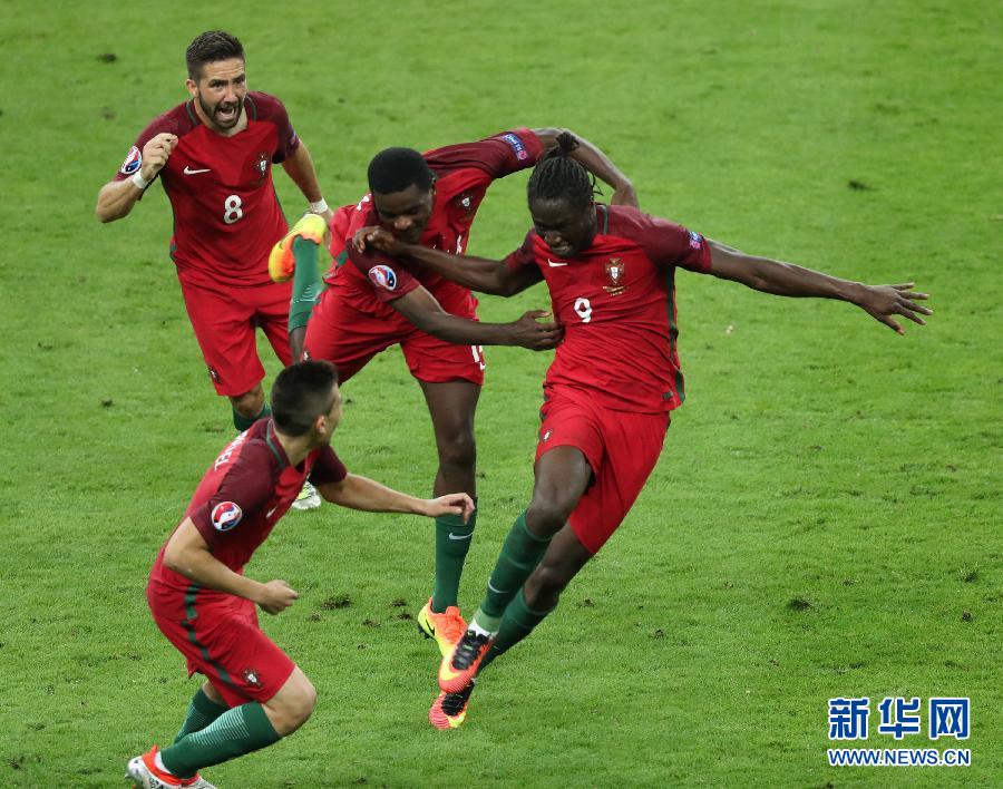 7月10日,葡萄牙队球员埃德尔(右)在进球后和队友庆祝。 当日,在法国巴黎进行的2016年欧洲足球锦标赛决赛中,法国队迎战葡萄牙队。新华社记者白雪飞摄