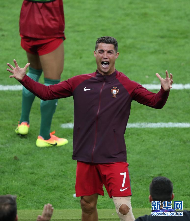 7月10日,葡萄牙队球员克·罗纳尔多(中)在比赛中受伤后被替换下场。当日,在法国巴黎进行的2016年欧洲足球锦标赛决赛中,法国队迎战葡萄牙队。 新华社记者白雪飞摄