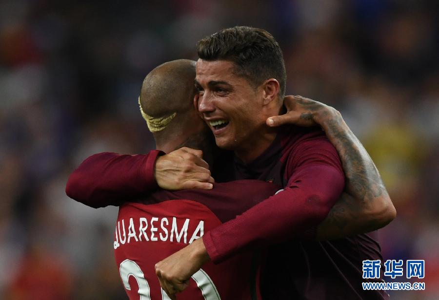 7月10日,葡萄牙队球员克·罗纳尔多(右)与队友夸雷斯马在比赛后庆祝。当日,在法国巴黎进行的2016年欧洲足球锦标赛决赛中,葡萄牙队以1比0战胜法国队,首次夺得欧锦赛冠军。 新华社记者郭勇摄