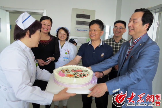 烟台市心理康复医院院长宫玉典将蛋糕送到护士手中