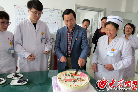 烟台市心理康复医院院长宫玉典为护士切蛋糕