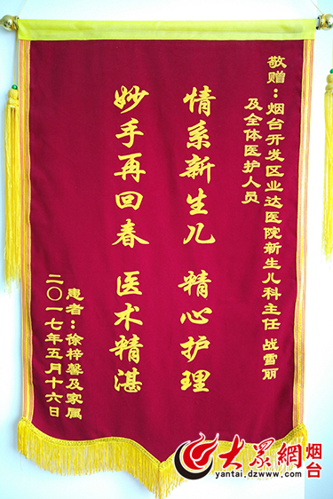 大众网烟台6月6日讯 (通讯员 战美丽 记者 曹平) 近日,烟台业达医院新生儿科经过三天三夜的抢救,成功救治一名患有重度新生儿肺炎、新生儿呼吸窘迫综合症的患儿。患儿恢复良好,在宝宝康复出院之际,患儿家长徐先生特地将一面写有“妙手再回春医术精湛,情系新生儿精心护理”的锦旗送到新生儿科主任战美丽的手中,对新生儿科的全体医护人员表示衷心的感谢。
