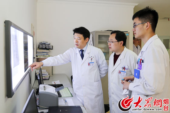 烟台毓璜顶医院泌尿外科主任医师王科(左一)和他的团队讨论患者病情