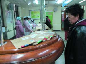 昨日下午,在协和医院一楼门诊室,记者看到,五六米长的木质分诊台上码着几十个牛皮纸口袋。这些口袋的边缘贴着印有数字的彩色标签,上端贴着条形码和人名,并用曲别针别着一张挂号单,下端有用黑色线框圈着的“内部资料 用完即还 北京市协和医院”等字样。