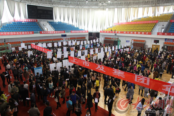 大众网烟台11月25日讯 (通讯员 李海兆 记者 姚辉) 近日,山东省2014年秋冬季高校毕业生服务“蓝黄”两区专场招聘会暨山东工商学院2015届毕业生供需见面会,在山东工商学院体育馆举行,来自山东省内外230余家用人单位以及近万名学生参加了本次招聘会。