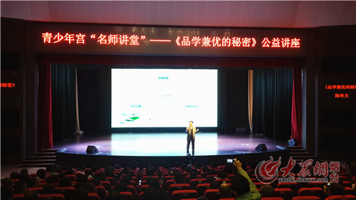 大众网烟台4月9日讯 (记者 邢晨 通讯员 王涵) “每个孩子都是最优秀的。”4月9日下午,北大附属实验学校烟台学校、烟台开发区青少年宫联合举办“品学兼优的秘密”大型教育公益讲座。中国著名教育专家、品格教育创始人陆传文老师结合丰富的实际教育案例为现场家长和学生们进行了专业的家庭教育方法辅导。