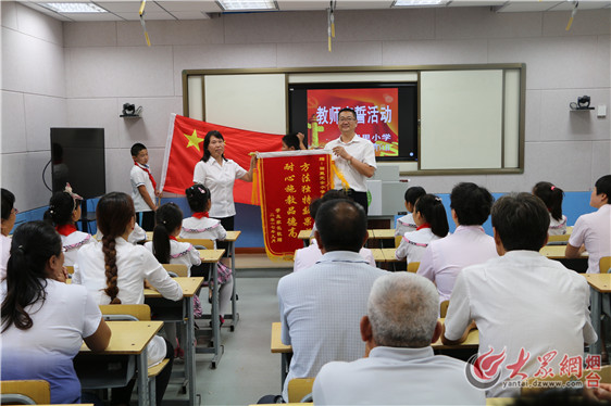 庄严的升国旗仪式,拉开了宣誓活动的序幕。接着,副校长宋吉法,代表学生家长为从教30年的优秀教师王金玲颁发了“方法独特效果好 耐心施教品德高”的锦旗。最后,全体教师在学生代表的见证下,面对国旗,在大队辅导员王老师的领呼下,庄严宣誓。