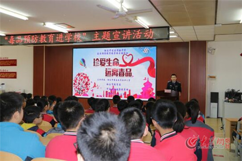 大众网烟台4月12日讯 (通讯员 郭丽 红波 记者 邢晨) 为了进一步加强学生对毒品的认识,增强学生的禁毒意识及自觉抵制毒品的侵蚀能力,营造安全、健康、和谐的校园学习氛围,烟台市禁毒办、烟台市教育局和中国安全健康教育网联合举办了“禁毒教育进学校”专题宣讲活动,开发区实验中学作为“烟台市禁毒示范学校”,成为本次宣讲活动的站点之一。4月11日,宣讲团来到开发区实验中学,为同学们开展了一次以“珍爱生命、远离毒品”为主题的禁毒教育宣讲活动,烟台开发区公安分局、开发区教体局相关领导及学校主要领导参加了本次活动。