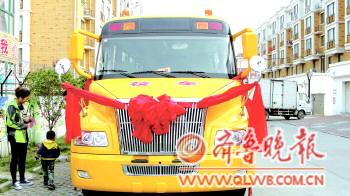 29日中午,记者在福山区康乐幼儿园看到两辆“大鼻子”校车停放在幼儿园门前。车头上还挂着红绸结成的大红花,显得醒目而且喜庆。有小朋友乐呵呵地围在车旁。