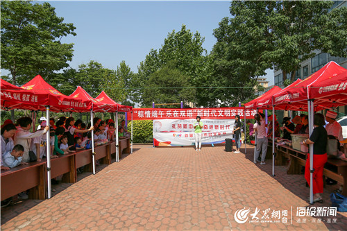 大众网·海报新闻6月2日讯 (记者 田丰恺) 为进一步弘扬中华民族优秀文化,让社区居民更加深入地感受端午节丰富的文化内涵,6月2日上午,莱州市文昌路街道双语社区开展“粽情端午 乐在双语”新时代文明实践活动。近百名社区党员、居民齐聚一堂,共享周末欢乐时光。