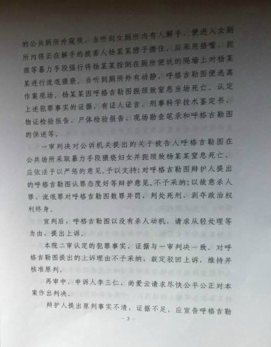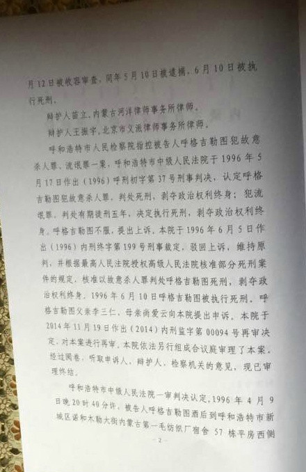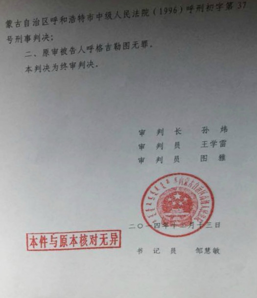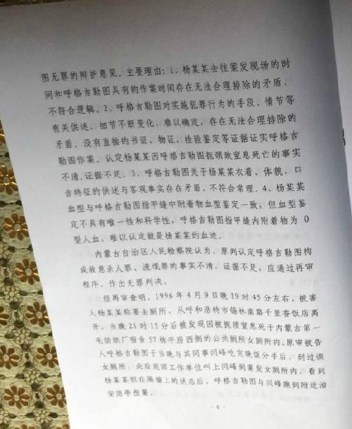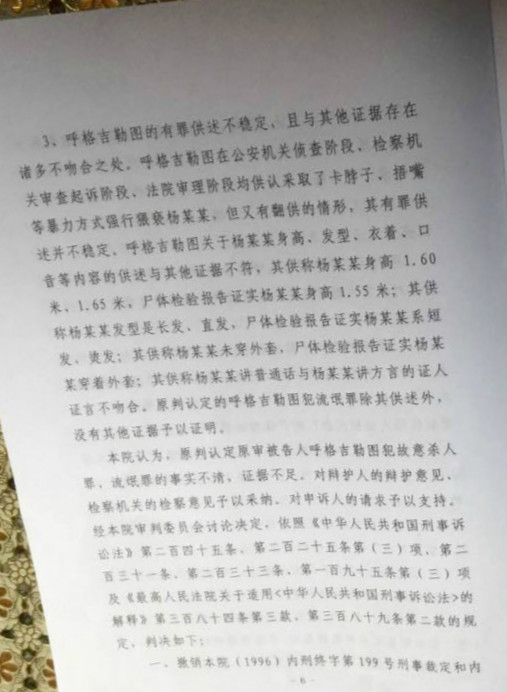 呼格吉勒图案再审判决书曝光 3理由判其无罪