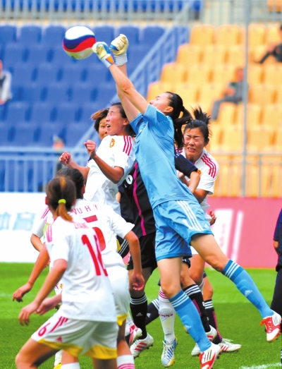 ▲昨日,中国女足守门员张越(上右)在比赛中门前救险。新华社发