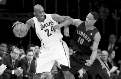 科比在比赛中与猛龙队球员德罗赞拼抢。新华社发