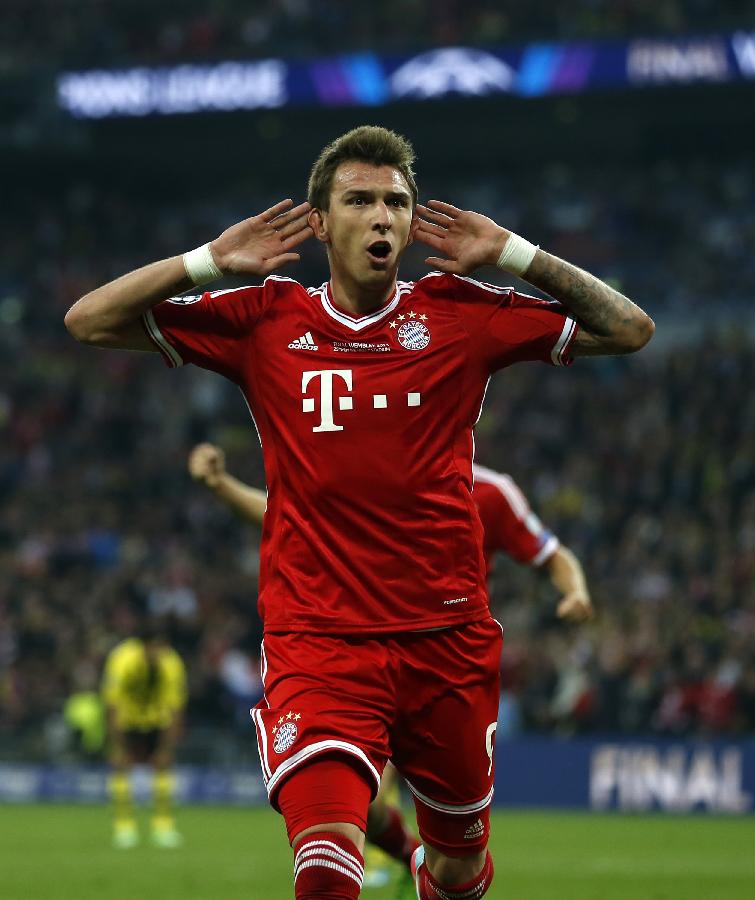 新华社照片,伦敦,2013年5月26日(体育)(36)足球——欧冠决赛:拜仁慕尼黑夺冠5月25日,拜仁慕尼黑队球员曼季茹基奇庆祝进球。当日,在英国伦敦温布利球场举行的2012-2013赛季欧洲足球冠军联赛决赛中,德甲拜仁慕尼黑队以2比1战胜另一支德甲球队多特蒙德队,夺得冠军。新华社记者王丽莉摄