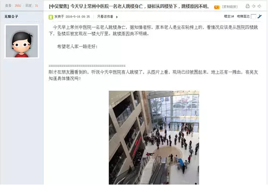 随后,记者在网上搜索,发现此跳楼的消息,在16日早上就在外地多家论坛发布,图片也和微信里的一模一样,帖子中称事发地点为常州中医院。虽然无法确认跳楼事件是否发生在常州中医院,但综合以上情况可以得知,该事件并非发生在福山人民医院。
